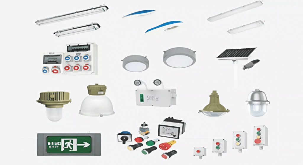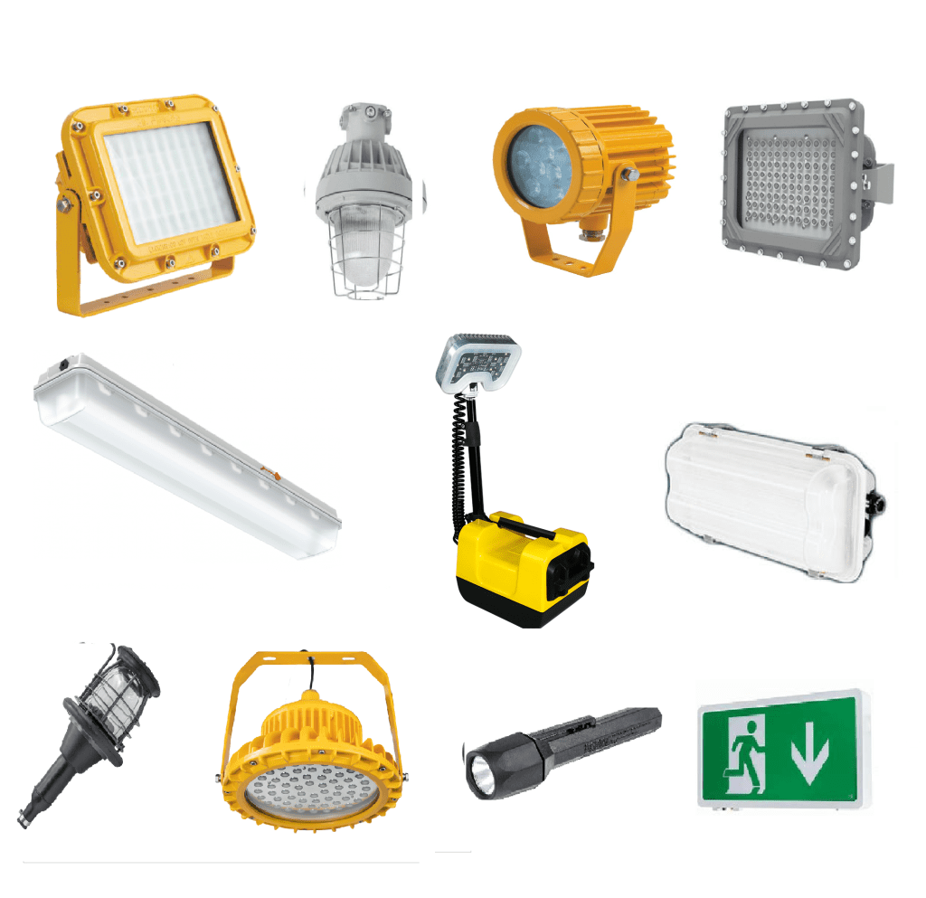 ATEX/IECEx-certified explosion-proof lighting solutions are designed for hazardous environments, ensuring safety and reliability. The range includes lighting fixtures, floodlights, high bay lights, flashers, hand lamps, tank lights, and various LED, fluorescent, and metal halide options to meet industrial needs.